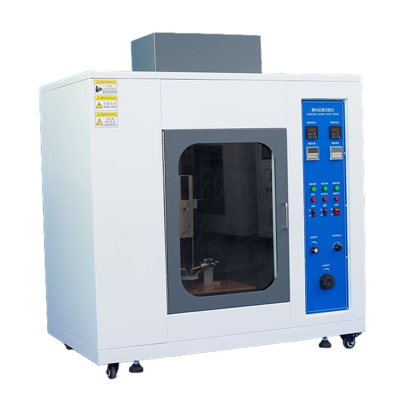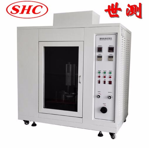 漏電起痕試驗是在固體絕緣材料表面上,在規(guī)定尺寸(2mm×5mm)的鉑電極之間,施加某一電壓并以一定的時間間隔(30s)及高度(35mm)滴下規(guī)定液滴體積的污染液體(0.1%NH4CL),用以評價固體絕緣材料表面在電場和污染介質(zhì)聯(lián)合作用下的耐受能力,測定其相比漏電起痕指數(shù)(CTI)和耐漏電起痕化指數(shù)(PTI)的模擬試驗。