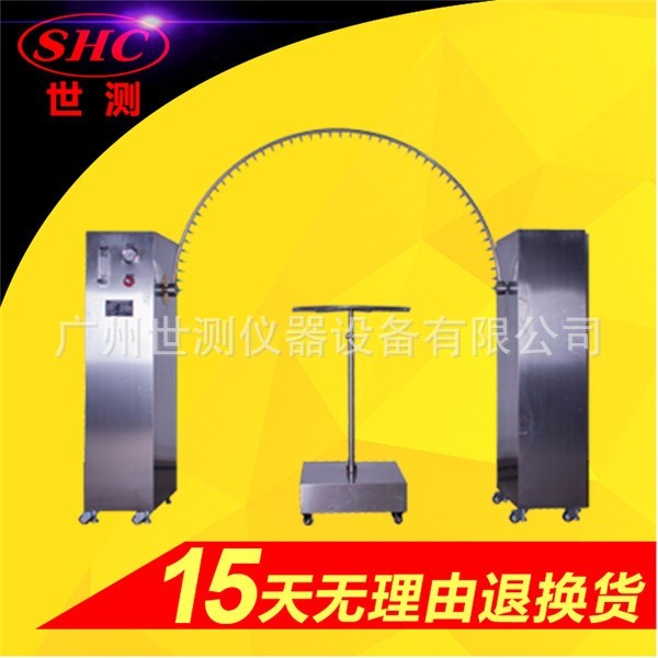 L/min。 淋水時(shí),擺管中點(diǎn)兩邊各60°弧段內(nèi)的噴水孔的噴水噴向樣品。被試樣品放在擺管半圓中心。擺管沿垂線(xiàn)兩邊各擺動(dòng)60°,共120°,試驗(yàn)時(shí)間:連續(xù)淋水10